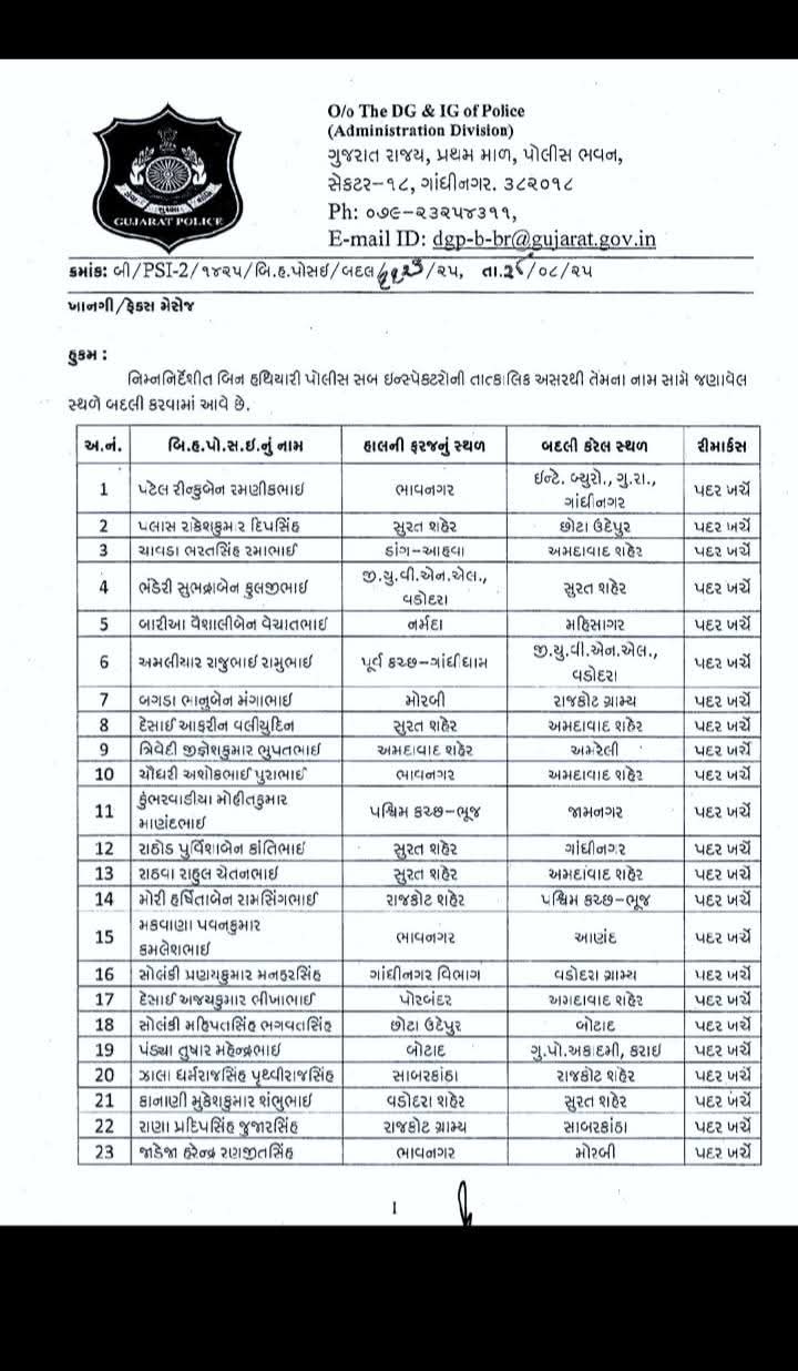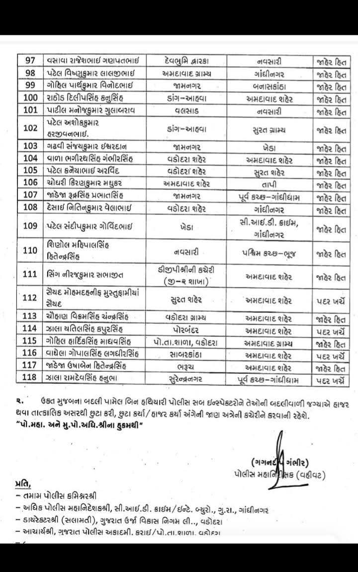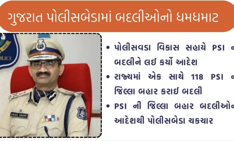 ગુજરાત પોલીસમાં મોટો ફેરબદલ જોવા મળી રહ્યો છે. રાજ્યના પોલીસ વડા દ્વારા 118 જેટલા પોલીસ સબ ઇન્સ્પેક્ટરની બદલીના આદેશ આપવામાં આવ્યા છે.