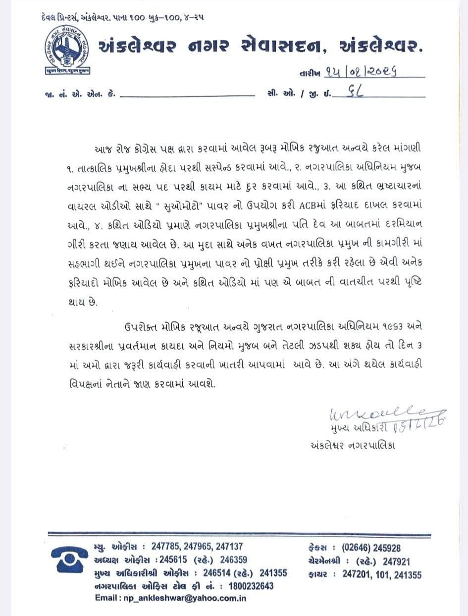 અંકલેશ્વર: અંકલેશ્વર નગરપાલિકામાં ભ્રષ્ટાચાર અને સત્તાના દુરુપયોગના આક્ષેપોને લઈને રાજકારણ ગરમાયું છે. હાલમાં સોશિયલ મીડિયામાં વાયરલ થયેલા એક કથિત ઓડિયો ક્લિપના મામલે કોંગ્રેસ પક્ષ દ્વારા નગરપાલિકાના પ્રમુખ સામે મોરચો માંડવામાં આવ્યો છે અને તેઓને હોદ્દા પરથી તાત્કાલિક અસરથી દૂર કરવાની માંગ કરવામાં આવી છે.